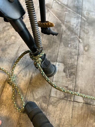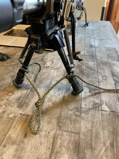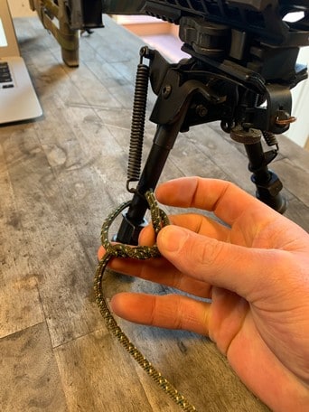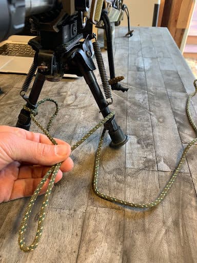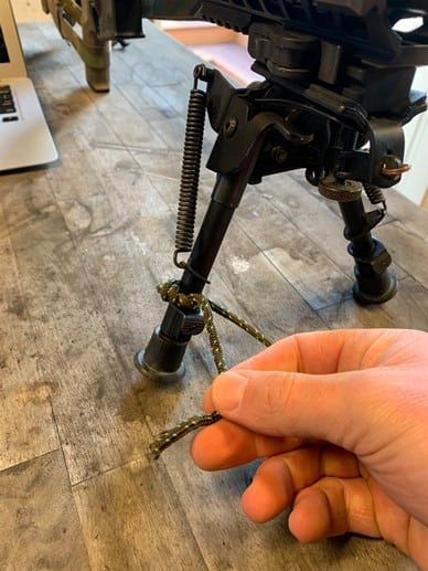 From here I tie the overhand knot in the center of the tether that I have created and check the overall setup to make sure it feels good. The snap of the bipod legs should be fairly easy when you pull it, you don’t want this long tether that is gonna snag on everything but also keep in mind you want it long enough to be able to grab it quickly and securely.