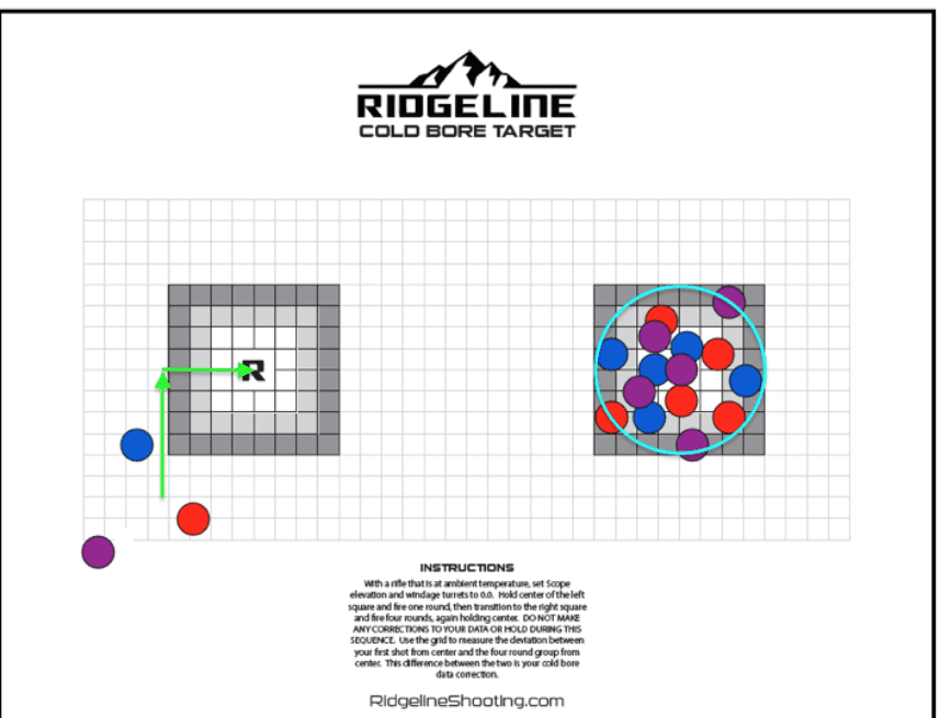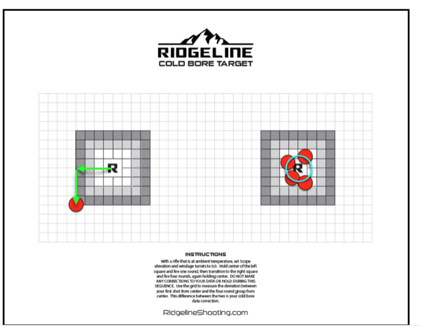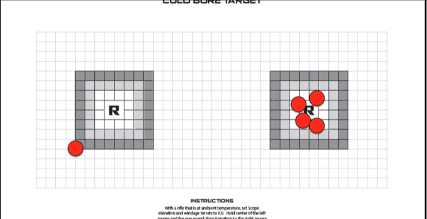 Step 1: With the a previously zeroed rifle and fouled bore (turrets set to “0/0”) that has been allowed to cool to ambient temperature, assume a good prone position and fire one round at the left target.